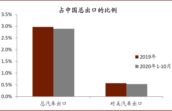 2019年,中国对美国汽车(含零配件)出口占中国全部出口的0.6%,这一比例在2020年1-10月为0.5%。如果将范围扩大,2019年中国汽车及零配件出口占全部出口额的3.0%,这一比例在2020年1-10月为2.9%。因此,汽车出口即使出现较高增长,对中国出口总体的拉动可能也较为有限。
