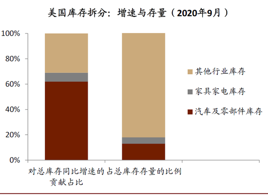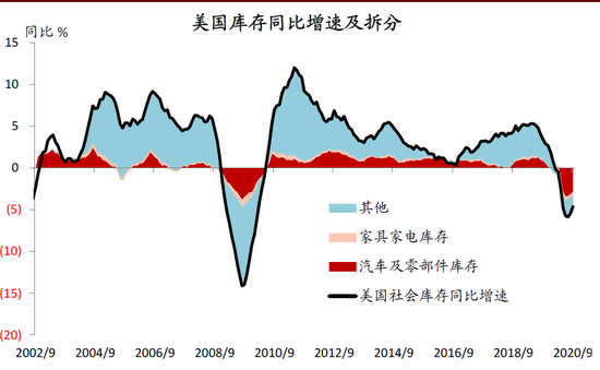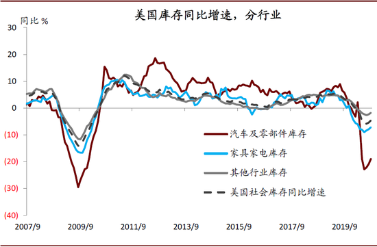 分行业来看,汽车及零配件库存是美国库存下降最重要的拖累因素,其他行业的拖累有限。