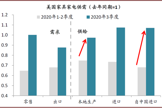 ► 美国家具家电行业库存处于低位,3季度进口加速快于生产。2020年9月家具家电库存同比增速为-7.2%,仍然明显低于总库存增速。此外,2020年3季度,美国从中国进口家电加速恢复,恢复速度明显快于本地生产。