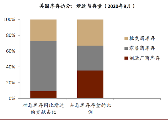 9月美国总库存(制造企业+批发商+零售商)同比增速为-4.7%。具体来看,零售商库存同比下降9.0%,降幅明显高于总库存降幅。虽然零售商库存总量仅占美国全部库存的31%,但是对总库存降幅的贡献率达到64%。