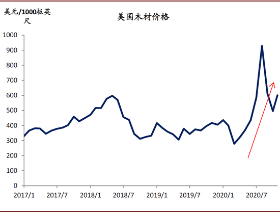 ► 美国在售独户住宅处于历史地位,部分上游材料价格已经跳升。美国可售房屋水平处于历史低位,盖房动力较强。在此背景下,部分原材料价格上升,木材价格尤为明显。
