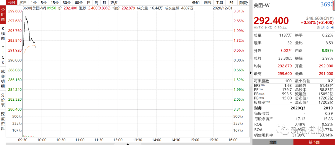 热点栏目12月1日消息,美团披露未经审核的2020年三季度业绩。报告显示,2020年第三季度营业收入354亿元人民币,去年同期274.9亿元人民币,同比增长28.8%;净利润63.2亿元人民币,去年同期13.33亿元,同比增长374.1%。公司股价高开低走,目前跳水转跌。