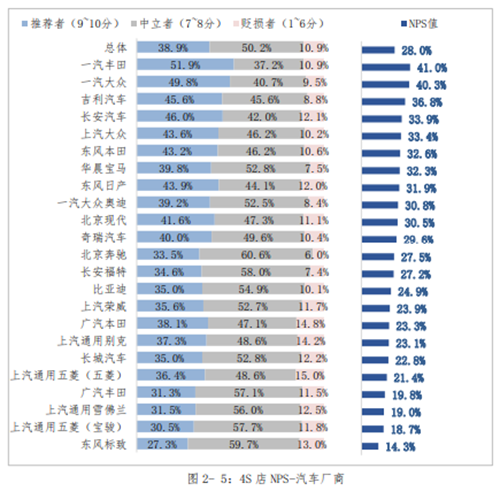 调查主要内容包括汽车4S店服务满意度评价和NPS(Net Promoter Score,净推荐值,即调查中推荐者所占的百分比减去批评者所占的百分比)、汽车质量、消费者权益保护三个方面。从调查结果来看,汽车4S店服务综合满意度得分为82.7分,总体表现良好。就4S店主要环节服务满意度得分来看,4S店销售服务满意度得分84.4分,排名最靠前;4S店售后服务满意度为83.5分,排名第二;4S店设备设施满意度为83.3分,排名第三;4S店投诉处理满意度为69.2分,得分排名最低。测评数据显示,消费者关于汽车质量的满意度综合得分为84.0分,总体处于良好水平;全国汽车4S店服务NPS净推荐值为28.0%,表明消费者对4S店服务忠诚度一般,行业发展面临一定压力。