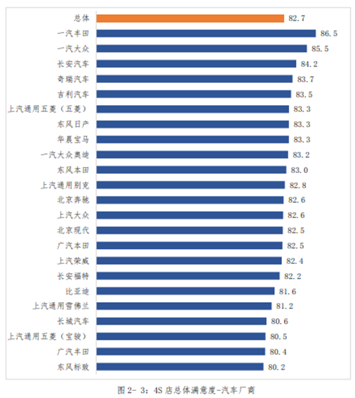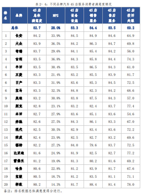 调查还发现,不同城市汽车4S店服务满意度有差异,总体呈现“北高南低”特点;不同车系4S店服务满意度从得分上看总体差异不大,德系得分最高,法系得分最低;从被调查的20个汽车品牌来看,长安汽车4S店服务满意度排名最高,为84.2分,标致汽车4S店服务满意度则以80.2分垫底。