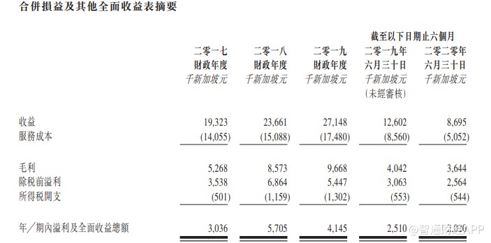 于2017财政年度、2018财政年度、2019财政年度各年及截至2020年6月30日止六个月,公司收益为1932.3万新加坡元、2366.1万新加坡元、2714.8万新加坡元、869.5万新加坡元。
