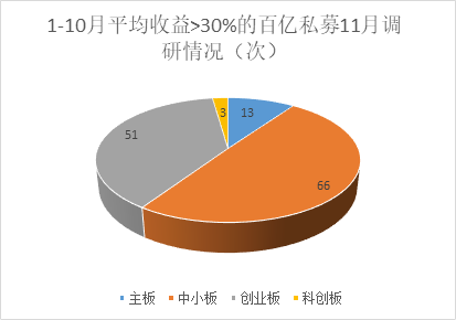 从具体调研机构来看,平均收益前十个月超过30%的22家百亿私募中,有15家在11月出现在了上市公司的调研名单中。整体来看,今年以来业绩较优的百亿私募11月对科技、医药、消费领域成长股的调研偏爱十分显著。相较主板和科创板,中小板和创业板的上市公司更受今年以来绩优的百亿私募的青睐。