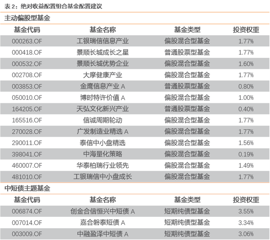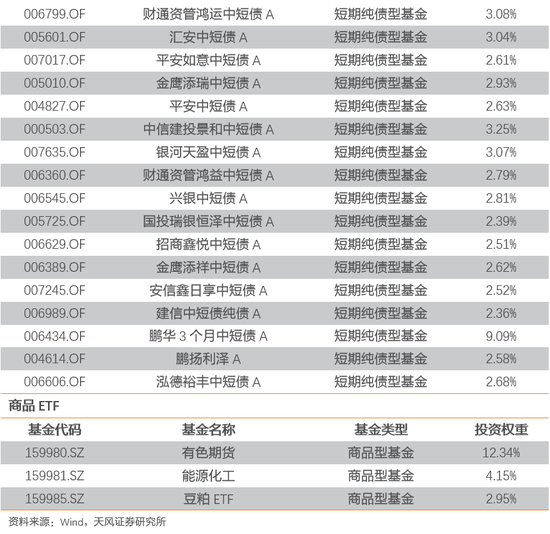 根据最新的仓位配置,我们分别在主动偏股型基金、中短债主题基金以及商品ETF基金中结合基金规模、Alpha、风险指标等维度筛选相应基金。考虑到偏股型基金的股票市值占比因素,我们根据持仓中主动偏股型基金最新季报的公布信息,对基金的股票市值占基金净值占比取均值,据此对主动偏股型基金配置总权重调整为17.65%,并对中短债主题基金总体权重做相应调整,最终基金推荐名单以及相应的权重配置建议如下。