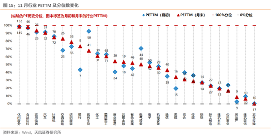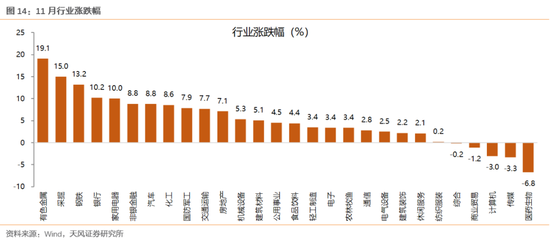 11月份,业绩趋势下的顺周期风格与日历效应下的低估值蓝筹风格共振,上证50、沪深300领涨,周期、金融表现突出。10月份以来,随着三季报业绩验证、美国大选落地、宏观经济持续改善,汽车、家电、化工、机械、有色等盈利底部改善的顺周期板块持续走强。而此时,表现突出的顺周期风格与日历效应所指引的低估值蓝筹的方向也一致,两条逻辑线强化了顺周期板块的上涨,行业间估值也进一步得到收敛。指数表现:上证50>沪深300>中证500>创业板指;风格表现:周期>金融>成长>消费;行业涨幅前五:有色(+19.1%)、采掘(+15%)、钢铁(+13.2%)、银行(+10.2%)、家电(+10%)。