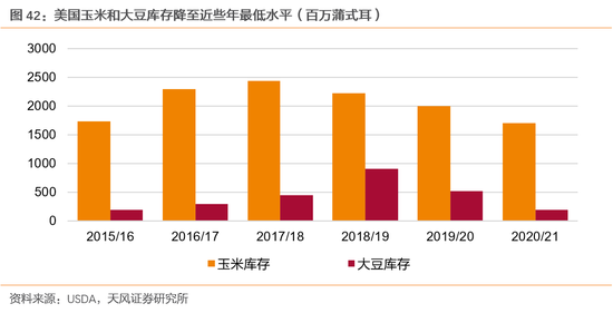 全球农产品供需也存在偏紧情况。11月10日,美国农业部预计本年度玉米和大豆库存降至七年来最低水平。其中,2020/2021年度美国期末库存下降至1.9亿蒲式耳。2020/2021年度美国玉米期末库存下降至17.02亿蒲式耳(一蒲式耳等于27千克)。