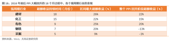 一是从PPI回升受益角度来讲,推荐化工、基本金属。未来半年是PPI持续回升的窗口期,回溯历史上,PPI回升期,板块的强弱表现:建材、化工持续性最好,建材、有色、化工超额收益最突出。