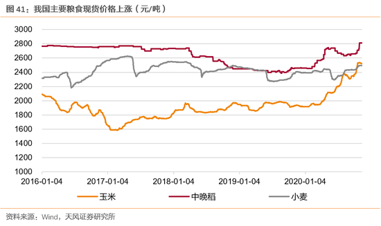 国内玉米价格上涨带动国内大类粮食作物价格上涨。小麦可代替部分玉米需求,玉米价格的上涨也带动小麦价格的提升,今年各地小麦市场价格大多超过了最低收购价;早籼稻、中晚籼稻以及粳稻价格也存在小幅上涨。进入2020年11月,中晚稻现货价涨至2800元/吨以上;小麦价格在进入11月后保持在2490元/吨以上。我们预计,国内农产品的价格上涨有望进一步提升农民种植积极性,利好种植产业链。