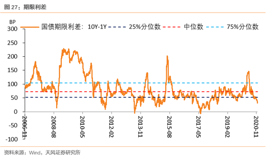 10月以来,收益率曲线进一步平坦化,国债期限利差进一步收窄,目前处于2006年以来10%分位数附近,处于2018年以来的2%分位数的附近。