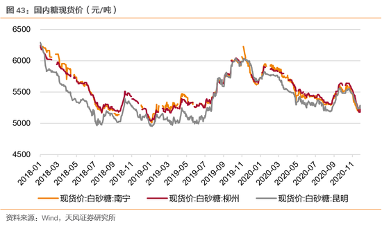 白糖方面,2019/2020年预估全球糖出口量约为5514.8万吨。根据Platts数据,全球近年来总需求突破1.8亿吨,年平均增速在0.8%,呈现小幅上行趋势。预计19/20与20/21年,国内外因疫情后消费需求复苏,全球供需或将呈现紧平衡。20/21年度,全球产销差继19/20年缺口91万吨后继续扩大至430万吨,连续两年持续扩大,为外盘糖价继续上行提供了支撑。我国自产糖常年供给量约在1000万吨上下。白糖高度依赖进口。2011-2019年,我国白糖进口量占国内消费量的平均占比为28%,进口依赖度较高。国内糖价有望出现联动外糖价上行趋势。