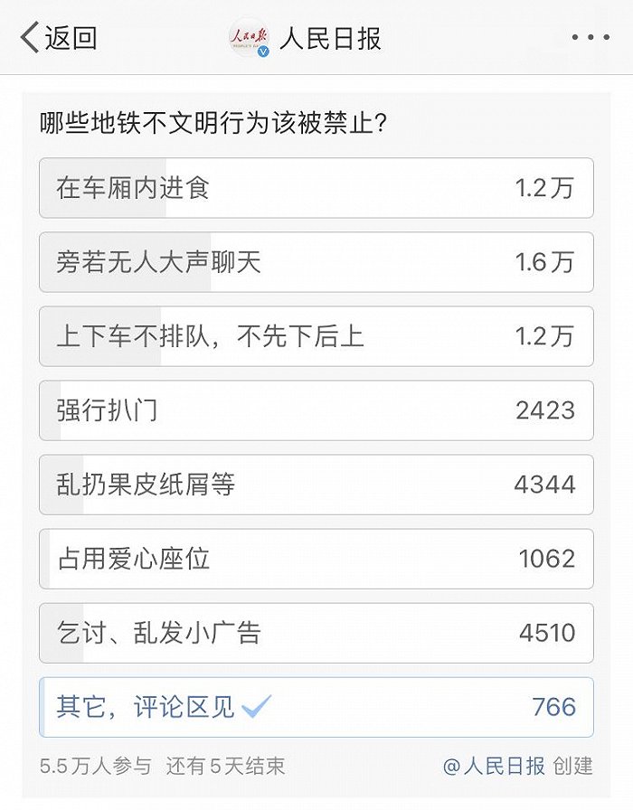 11月30日,人民日报在微博上做了一项调查,哪些地铁不文明行为该被禁止?5.5万参与投票的网友中,1.6万人认为“旁若无人大声聊天”应该被禁止。“在车厢内进食”、“上下车不排队、不先上后下”的投票率也很高,均获得了1.2万投票。