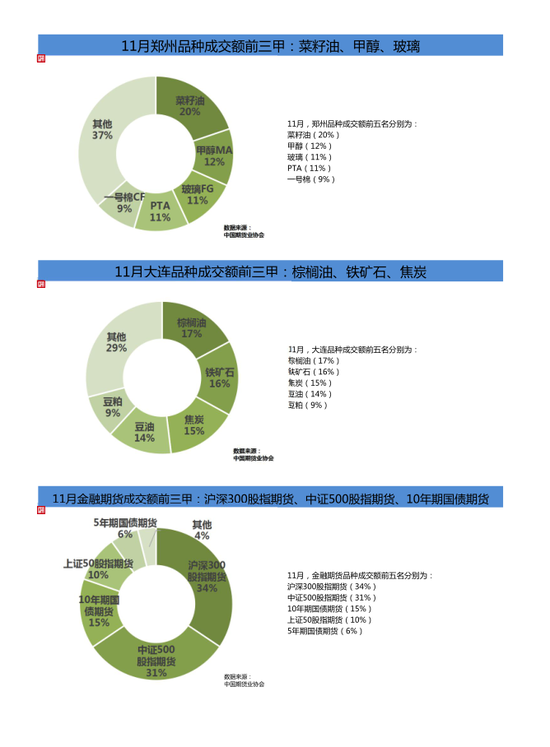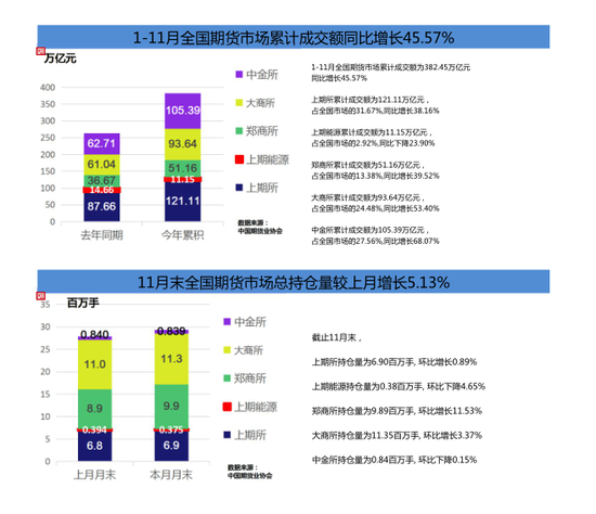 中国期货业协会最新统计资料表明,11月全国期货市场交易规模较上月增长,以单边计算,当月全国期货市场成交量为640,501,544手,成交额为464,918.50亿元,同比分别增长63.99%和70.26%,环比分别增长35.09%和40.21%。1-11月全国期货市场累计成交量为 5,379,951,101手,累计成交额为3,824,539.94亿元,同比分别增长50.45%和45.57%。