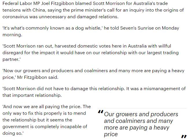 “斯科特·莫里森跑了出来,他(借此来)收割国内选票,却故意无视这对我们与澳大利亚最大贸易伙伴关系(指中国)的影响,”菲茨吉本说,“现在,我们的种植者、生产商、煤矿工人以及更多的人正在付出沉重的代价。”