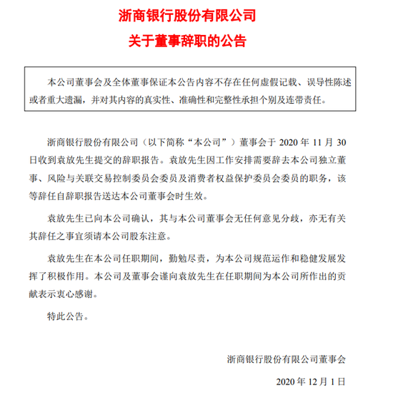 此外,董事会于2020年11月30日收到袁放提交的辞职报告。袁放因工作安排需要辞去独立非执行董事职务,且不再于任何董事会专门委员会担任职务,该等辞任自辞职报告送达董事会时生效。