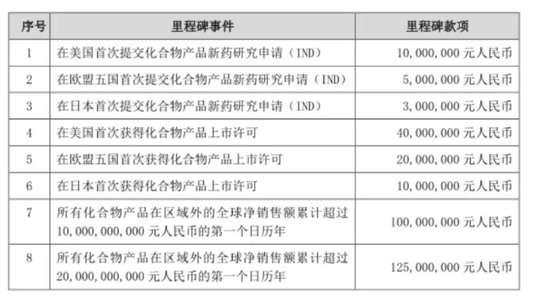 里程碑付款方式较为特色,主要在医药研发和购买新药专利方面会使用,要达到“里程碑事件”后,受让方才会向转让方支付款项。而此次转让中,提出的“里程碑事件”有八个,并且有相应的里程碑款项,需要在首次实现相应的里程碑事件时支付一次。