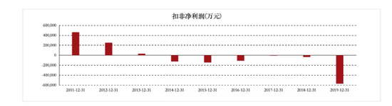 从扣非净利润看,苏宁易购2014年-2019年的利润一直为负,分别为-12.52亿元、-14.65亿元、-11.08亿元、-0.88亿元、-3.59亿元、-57.1亿元。2019年,扣非净利润也是近年来亏损最多的一年。