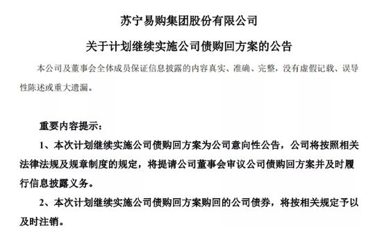 此前,11月23日晚间,苏宁易购发布公告称,为持续增强投资者信心,维护公司债券价格稳定,促进公司的长期稳定发展,公司计划继续实施公司债购回方案。