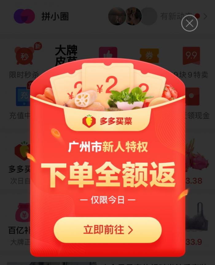 生鲜O2O商业模式已经探索多年,至今还是群雄逐鹿的局面,真正的头部赢家还未落定。为了能抢占市场,资本巨额补贴的“烧钱”模式已经是中国互联网巨头常用的手法,在这次社区团购中也再次被复制。这些社区团购平台上通过优惠券等低价方式吸引用户使用。譬如,打开记者打开拼多多APP就是“多多买菜”的弹窗,提示“新人特权下单全额返”。
