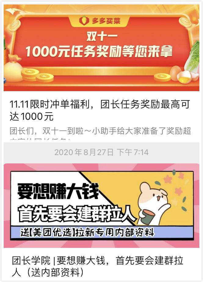 翻开“美团优选”“多多买菜”等社区团购平台的公众号,团长招募活动正在火热进行中,很多微信推文内容都是针对团长招募和培训,可见平台对抢占社区团长资源的重视,美团优选就提出自己的愿景“携手百万团长,服务一亿家庭”。