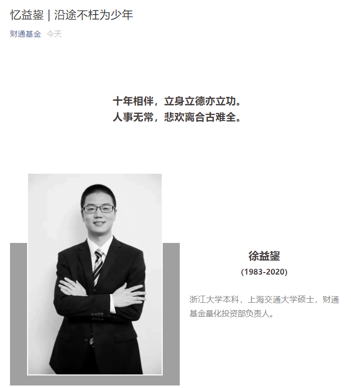 就在同一天,30日,财通基金官微发布讣告,量化投资部负责人徐益鋆突然离世。