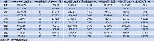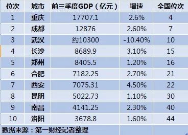 数据显示,前三季度中西部GDP十强城市分别是重庆、成都、武汉、长沙、郑州、合肥、西安、昆明、南昌和洛阳,与2019年全年一致。