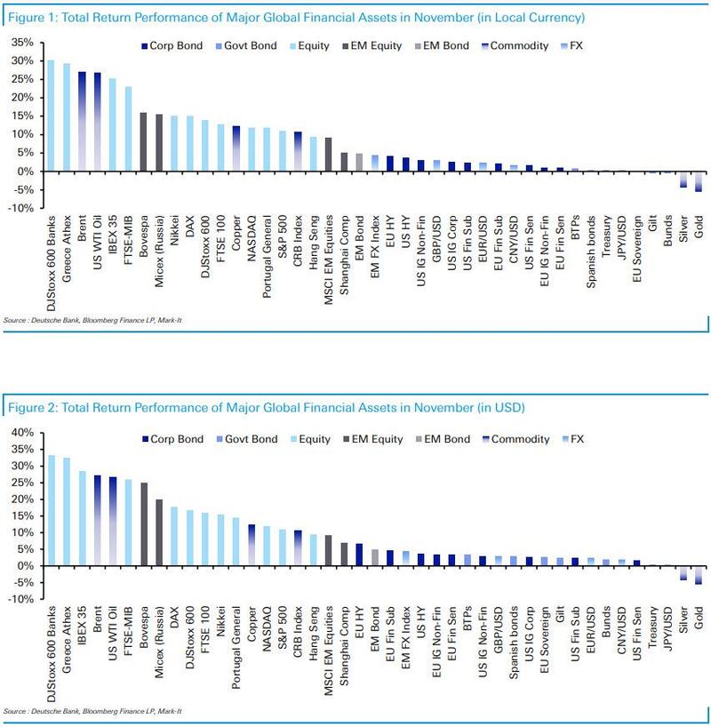 从资产收益排行榜来看,风险资产在11月份的表现最为突出,以当地货币计算,STOXX 600银行股、希腊Athex指数和布伦特原油的表现最为强劲。另一项表现强劲的资产是比特币,继10月份上涨29.4%之后,比特币11月再度上涨了39.9%(尽管比特币并没有被列在德银的榜单中)。与此同时,斯托克600指数上涨13.7%,创下月度最大涨幅。