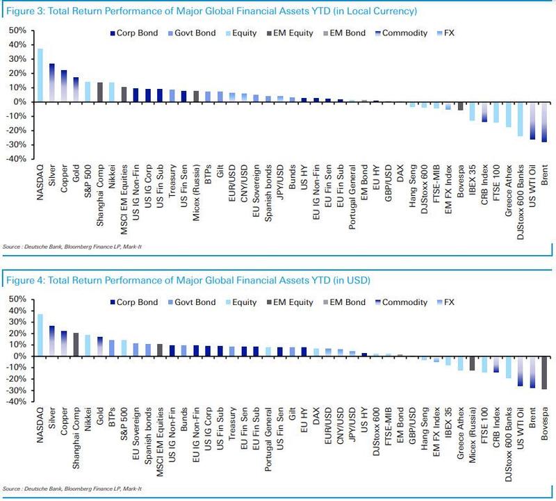 而此消彼长下,避险资金的流失意味着黄金(-5.4%)和白银(-4.3%)成为了德银月度榜单中表现最差的资产,其中黄金更是录得了4年来最糟糕的月度表现。