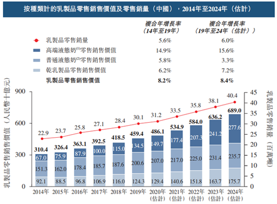 根据弗若斯特沙利文报告,乳制品消费量由2014年的22.9百万吨(人均16.7公斤)增至2019年的30.1百万吨(人均21.5公斤),并预计于2024年进一步增至40.4百万吨(人均28.5公斤)。