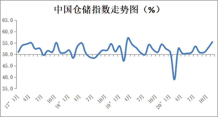 中国网财经12月2日讯 据中国物流与采购联合会网站消息,2020年11月份中国物流业景气指数为57.5%,较上月回升1.2个百分点;中国仓储指数为56.9%,较上月回升4.1个百分点。