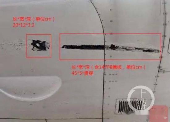 ▲涉事飞机机腹出现两处损伤,其中一处贯穿机身。图片来源/川观新闻