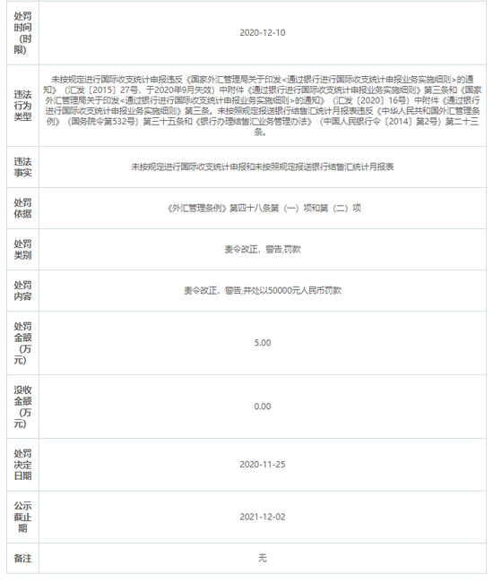 12月2日消息,国家外汇管理局公布的行政处罚信息公开表显示,中国银行股份有限公司崇左分行因未按规定进行国际收支统计申报和未按照规定报送银行结售汇统计月报表,被责令改正、给予警告处分并处罚款5万元。