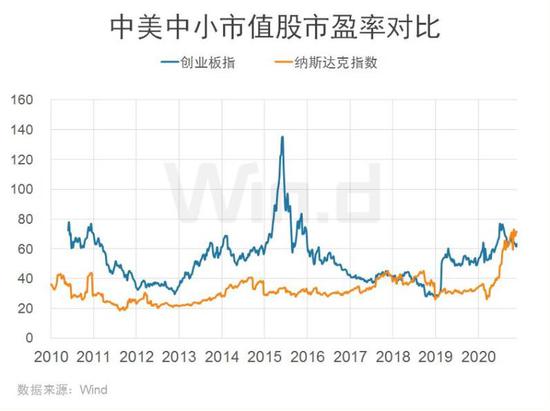 在小市值公司方面,由于纳斯达克市场是世界上创业板市场最为成功的典型,因此我们选取A股创业板与纳斯达克市场进行比较。