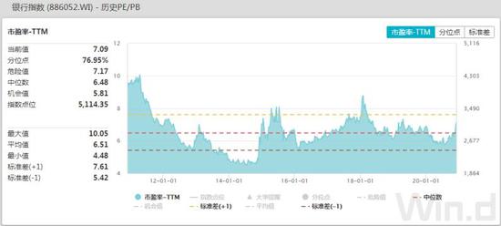 从行业来看,当前银行板块估值最低,最新市盈率仅为7.07倍,与十年均值相当(6.92倍)。