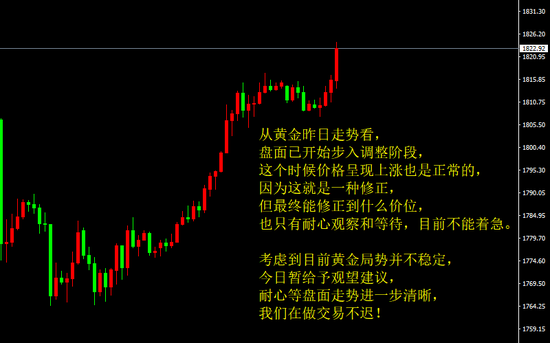 考虑到目前黄金局势并不稳定,今日暂给予观望建议,耐心等盘面走势进一步清晰,我们在做交易不迟!