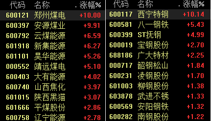 在期货市场行情的火热下,A股相关概念也呈现出大涨趋势。截至今日收盘,钢铁、煤炭板块大涨,西宁特钢、郑州煤电、安源煤业涨停,云煤能源、新集能源涨超6%,八一钢铁大涨超5%。