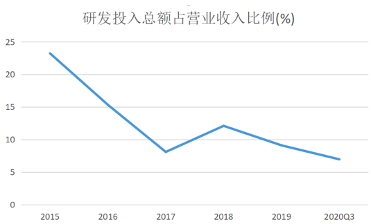 尽管研发团队占优,但卓胜微研发投入总额占营业收入比例呈逐年下降状态