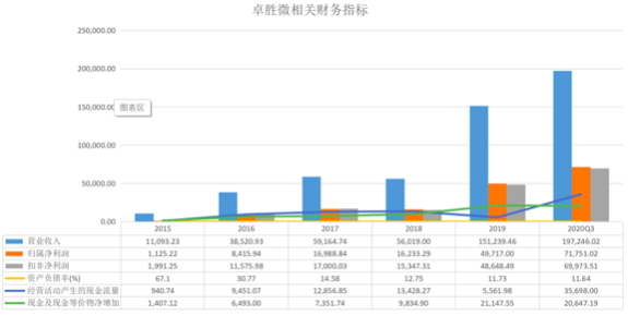 卓胜微近年来业绩持续向好,营收、现金流都较为不错