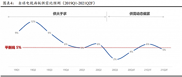 综合供需两方面的因素,根据奥维睿沃的预测,2021年上半年电视面板整体供需仍然持续偏紧,预计20Q1供需略高于市场平衡线,20Q2受下游需求带动,供需将略低于市场平衡线。
