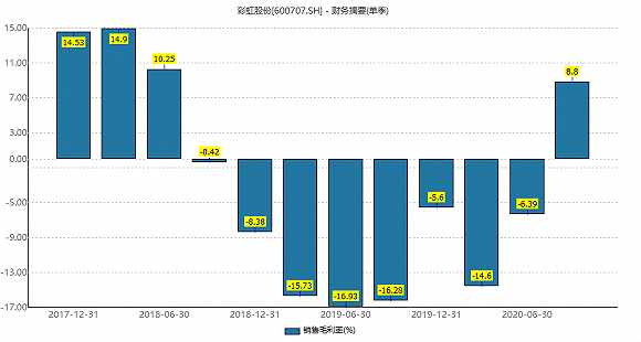 事实证明,这些顾虑并非空穴来风。彩虹股份在2017年增资之后不久,经营再度陷入困境。2018Q3到2020Q2期间,公司的毛利率一直为负。