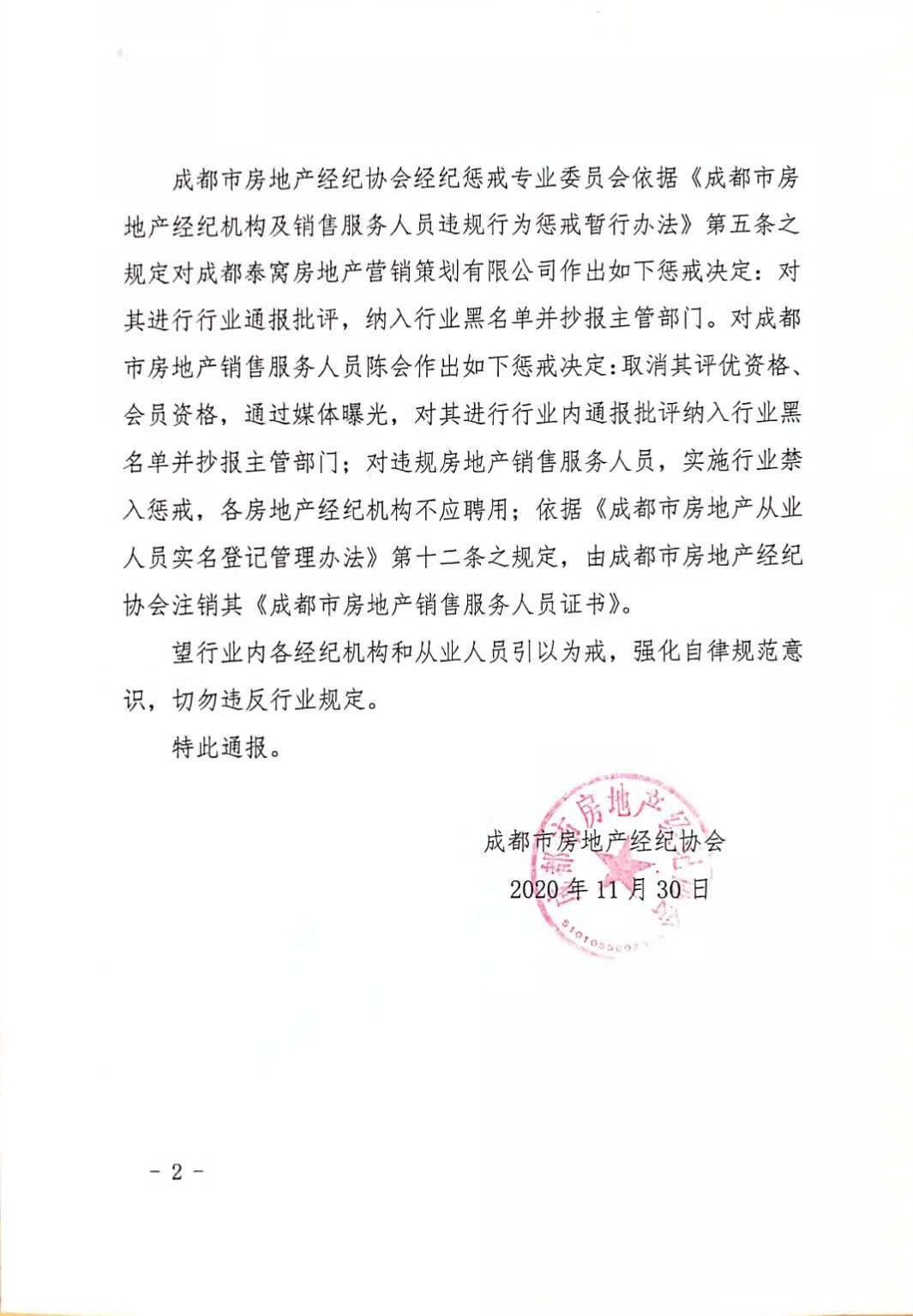 12月2日,四川省成都市房地产经纪协会官网通报了对成都泰窝房地产营销策划有限公司、成都市房地产销售服务人员陈某违规行为予以自律惩戒。