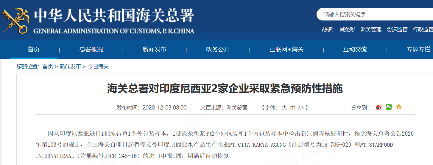 此外,因从印度尼西亚进口1批冻带鱼1个外包装样本,1批冻杂鱼浆的2个外包装和1个内包装样本中检出新冠病毒核酸阳性,按照海关总署公告2020年第103号的规定,全国海关自即日起暂停接受印度尼西亚水产品生产企业PT.CITA KARYA AGUNG(注册编号为CR 706-02)和PT.STARFOOD INTERNATIONAL(注册编号为CR 245-16)的进口申报1周,期满后自动恢复。