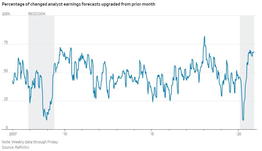 这反映了预期利润大幅改善。华尔街众多分析师都在上调预期,过去四周对标普500指数成分股公司的预测调整中,有三分之二是上调。这一比例略低于夏季时的水平,当时分析师上调了3月份被大幅下修的预测,否则这将是自2018年1月牛市以来的最高水平。
