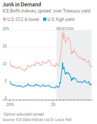 衡量垃圾债券的更广泛指标的收益率价差仍高于年初水平,不过已回到去年夏季的水平。今年额外累积的巨额债务似乎并未困扰投资者。