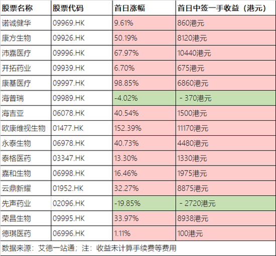 同时近2个月上市的医药/生物科技类股票表现也出现“降温”现象,除了荣昌生物(09995.HK)上市首日大涨+33.97%,另外两支股票中,先声药业(02096.HK)录得下跌,德琪医药(06996.HK)也仅有+1.11%的微涨。