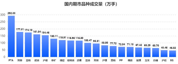 期市成交方面,有色、化工等热点板块交投保持火热,期市交投较昨日回升。受助于原油上涨,PTA拉升,成交量放大七成,跃至成交量排名首位, 甲醇、豆粕分列二三位。沪银强势不在,交投回落两成,排名下滑至第五位。