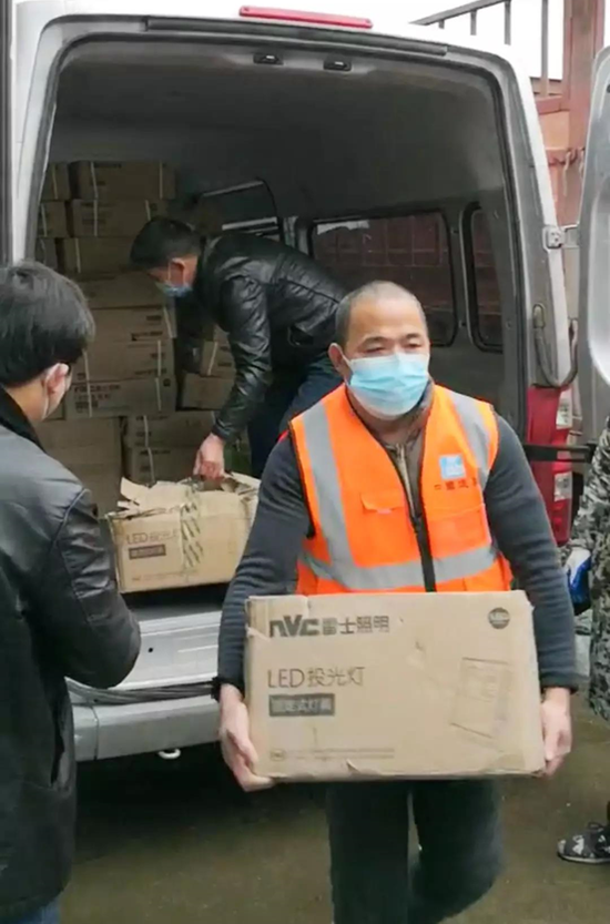 中建三局建筑工人和雷士照明员工在火神山医院施工现场卸货