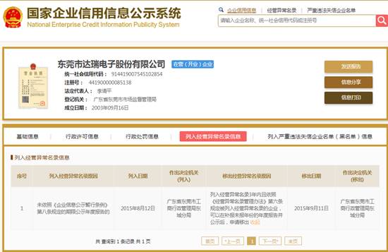 另据国家企业信用信息公示系统显示,达瑞电子曾于2015年8月12日被广东省东莞市工商行政管理局东城分局列入经营异常名录,列入原因为未依照《企业信息公示暂行条例》第八条规定的期限公示年度报告,2015年9月11日移出。